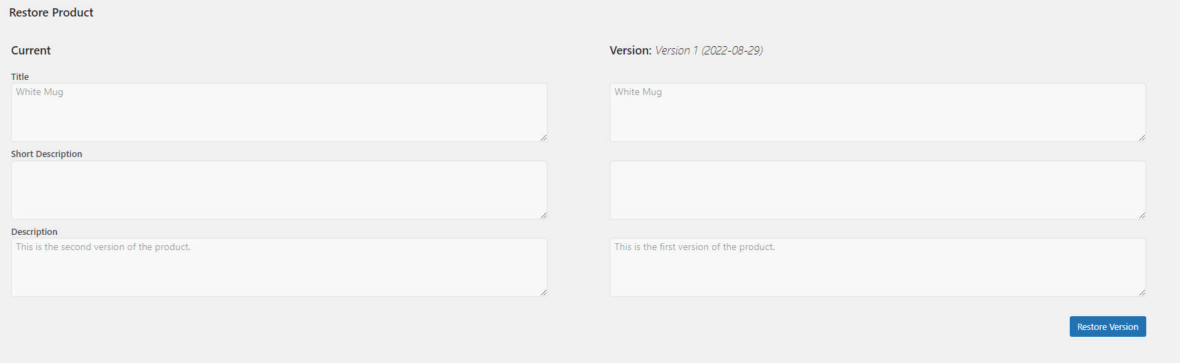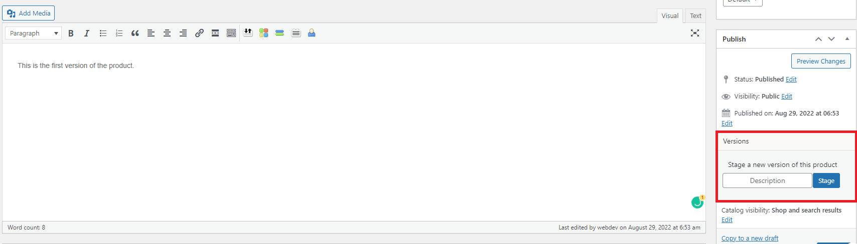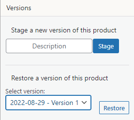Product Versions This plugin allows you to: Created staged versions of your products before editing itReturn to any staged version by restoring itCompare a staged version with the current version of the product before restoring Compare the current and staged version before restoring it Restore the version when needed Stage a version of the product before editing it.